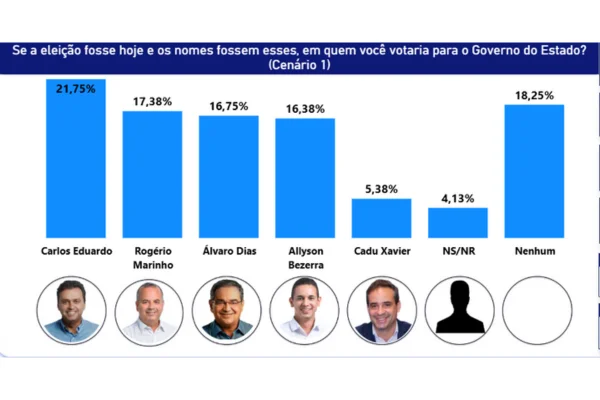 No Cenário 1, que reúne os principais nomes cotados para a disputa, o ex-prefeito Carlos Eduardo (PSD) aparece na liderança, com 21,75% das intenções de voto. Em seguida, surgem Rogério Marinho (PL), com 17,38%, Álvaro Dias (Republicanos), com 16,75%, e Allyson Bezerra (UB), com 16,38%, configurando um empate técnico entre os três. O pré-candidato Cadu Xavier (PT) registra 5,38%. A opção “Nenhum” soma 18,25%, enquanto 4,13% dos entrevistados não souberam ou não responderam.