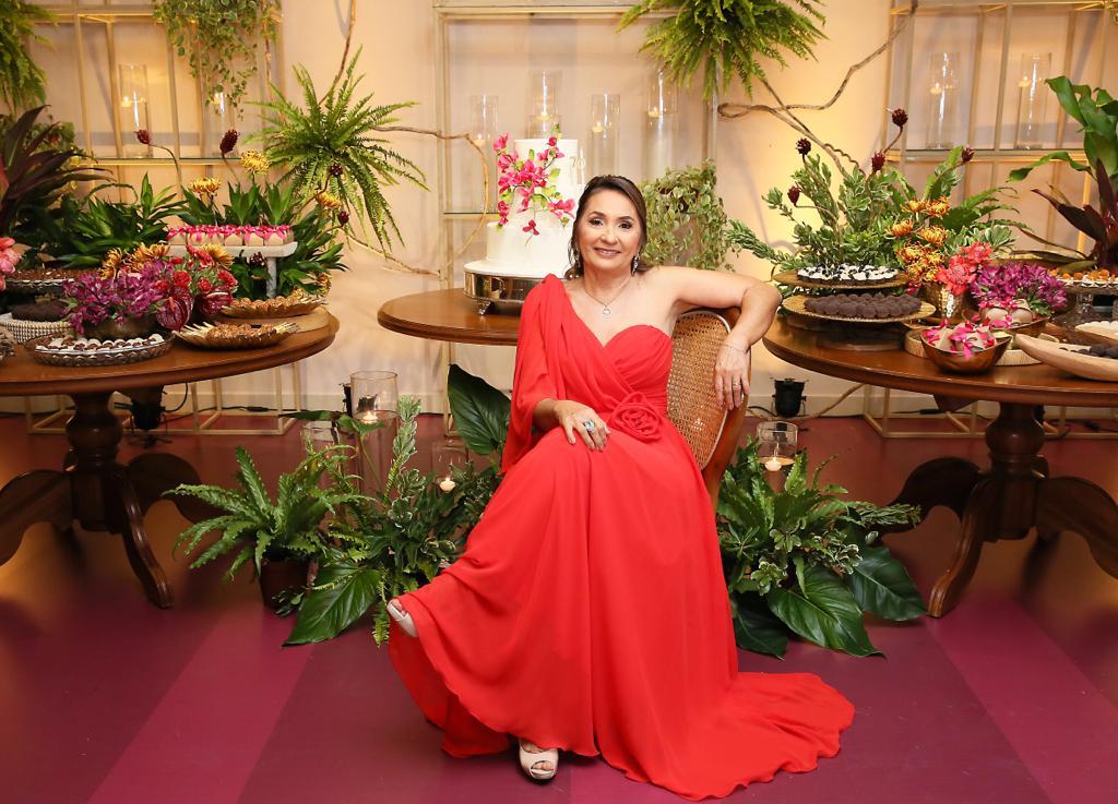 Como a aniversariante estava radiante, linda, ainda mais, já que beleza nunca lhe faltou, em um vestido vermelho também lindo.