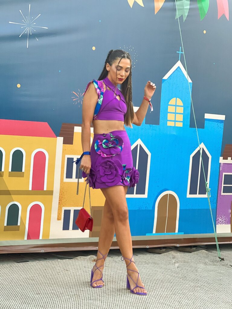 Também merecem registros as meninas que comandaram a festa em cima do trio. Começamos por Heloisa Fernandes, a Helô do Forró dos Três. Ela estava vestida a la cangaceira moderna, linda, chique. E aqui, quero registrar, não só Helô, mas toda formação do Forró dos Três, que apostaram em uma vestimenta leve, cheia de história, onde o sertão nordestino era o destaque com seu sol de rachar, cactos… e beleza. Meninos, vocês simplesmente arrasaram.