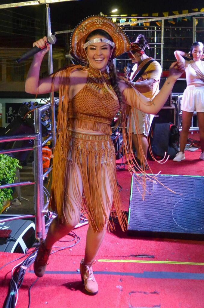 A cantora Renata Falcão também acertou. Optou por uma cangaceira toda no macramê, franjas, e o chapéu de couro, que não pode faltar. O look foi desenvolvido pelo artesão Victor Marlley e produção da Arteando Ambientes. Brilhou!