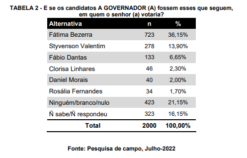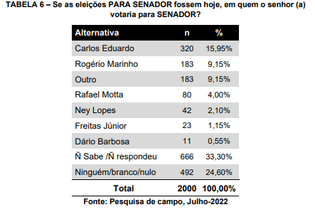 Na sondagem estimulada, ele tem 22,85% das intenções de votos, seguido por Rogério Marinho (PL), com 12,65% e, em terceiro lugar, pelo presidente estadual do PSB, deputado federal Rafael Motta, com 5,15%.