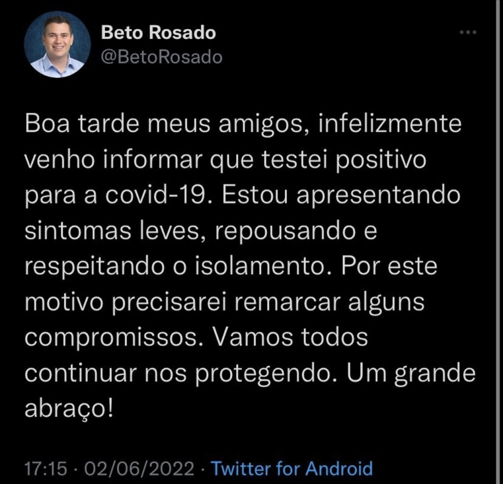 O deputado federal Beto Rosado (PP) testou positivo para a COVID-19.